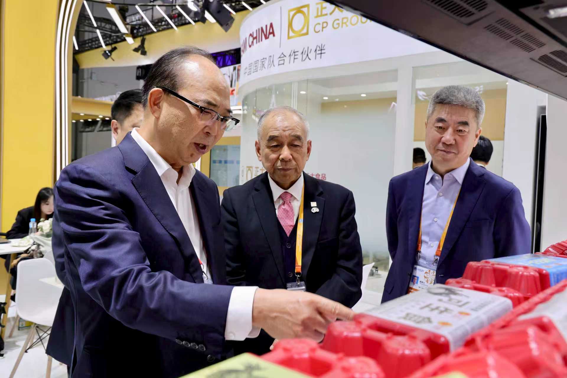 ▲11月5日,益海嘉里金龍魚糧油食品股份有限公司總裁穆彥魁(左一)一行參觀正大展館,薛增一資深副董事長(左二)等熱情接待來賓并介紹正大雞蛋產品。