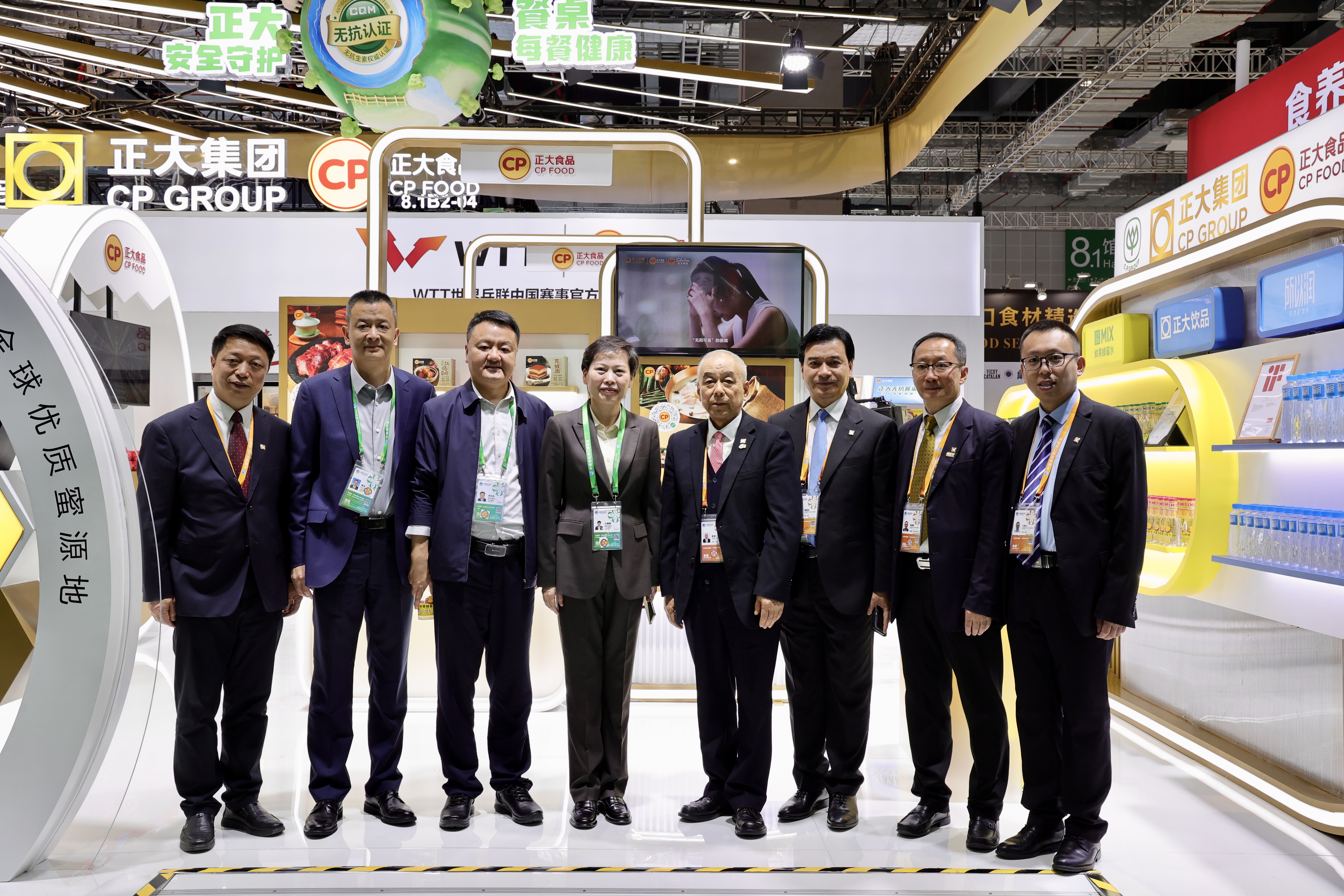 ▲11月5日,麥德龍集團執行董事長兼聯席CEO許少川(右四)一行參觀正大展館,羅家順集團資深副董事長(左四)、薛增一資深副董事長(右三)、王富杰資深副董事長(右二)、正大集團農牧食品企業中國區副董事長揚綱(左二)等熱情接待來賓并合影留念。