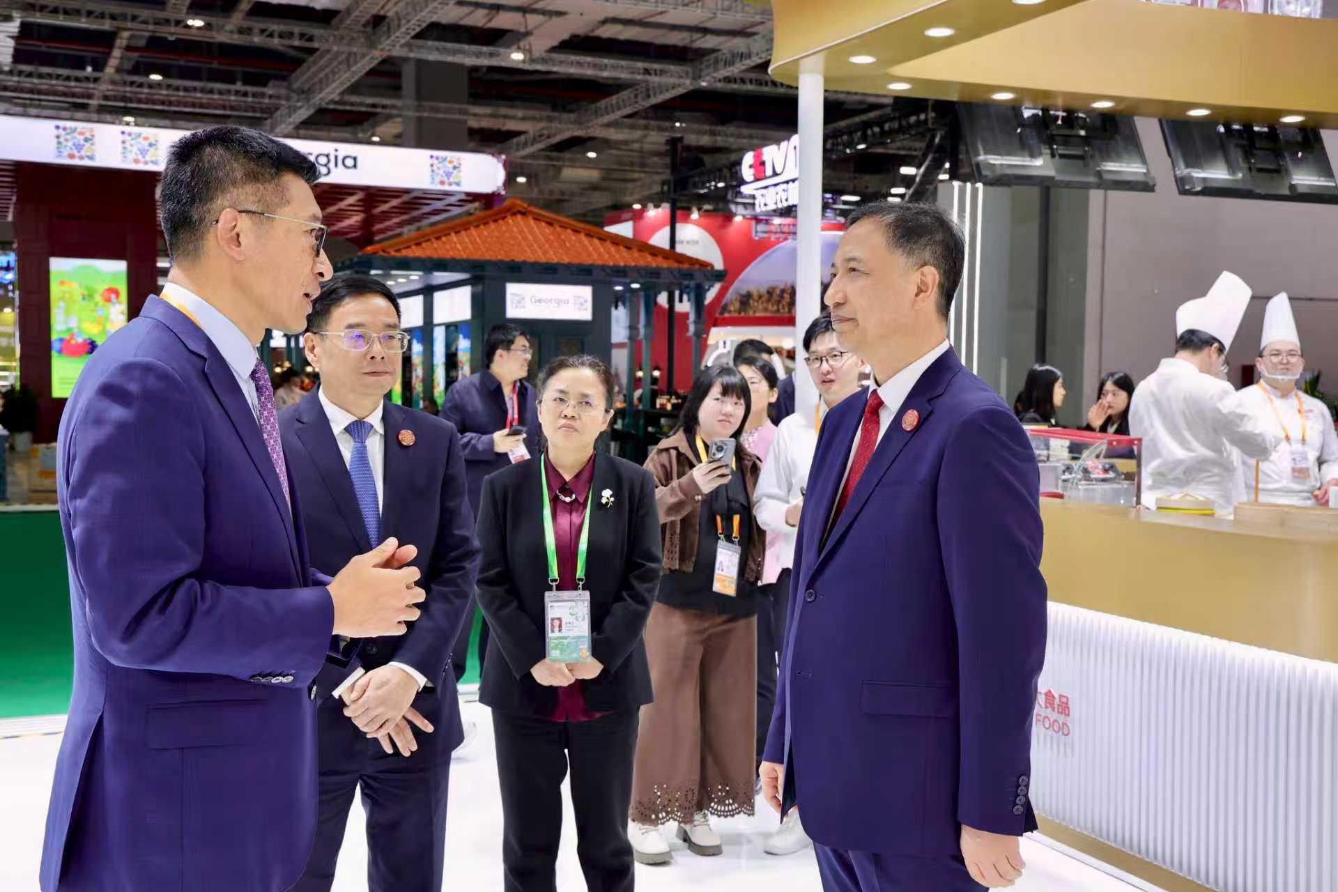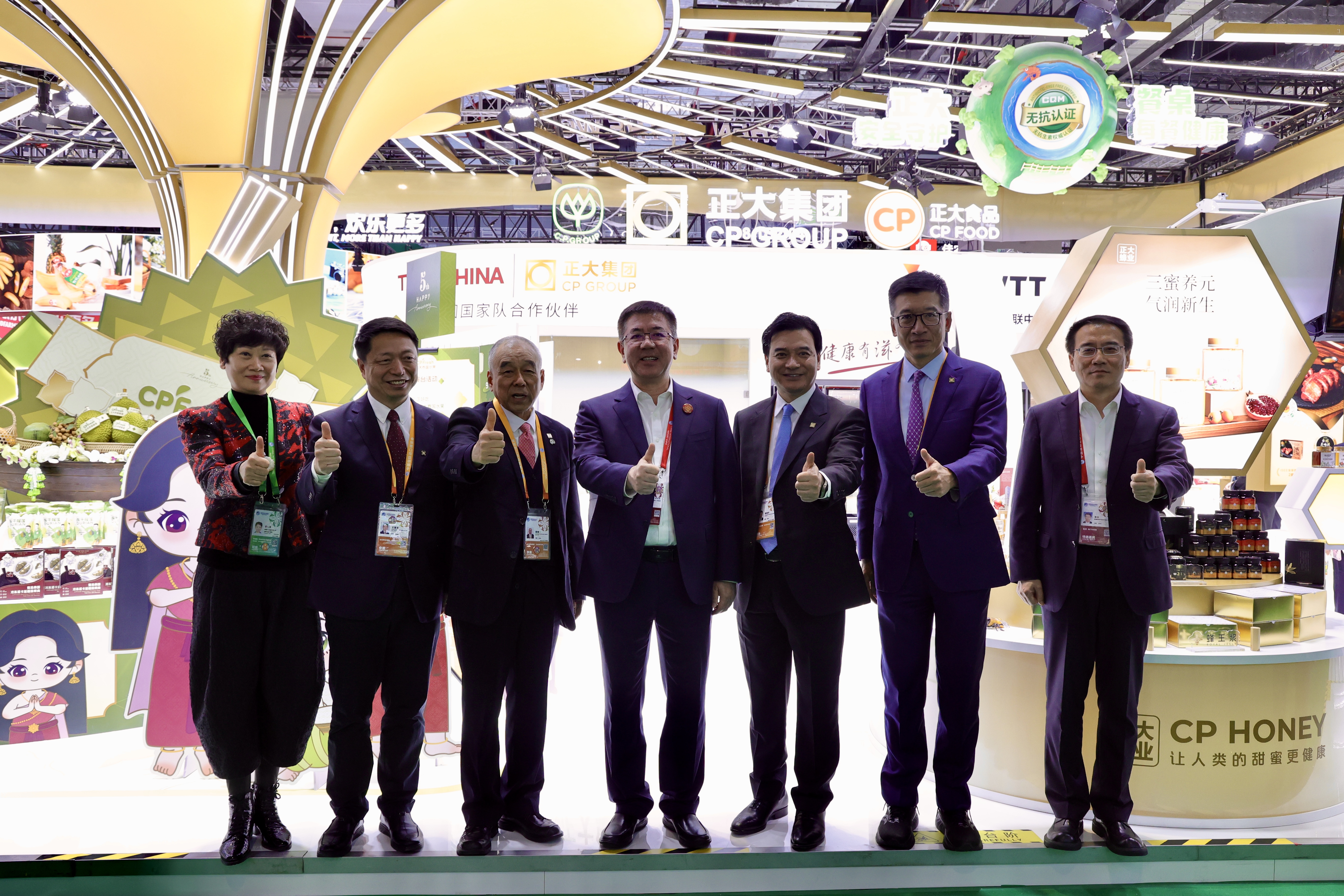 ▲11月5日,河南省商務廳黨組書記、廳長王振利(右一)一行參觀正大展館,薛增一資深副董事長(右二)等熱情接待來賓并介紹正大MIX鮮果蜂蜜水。