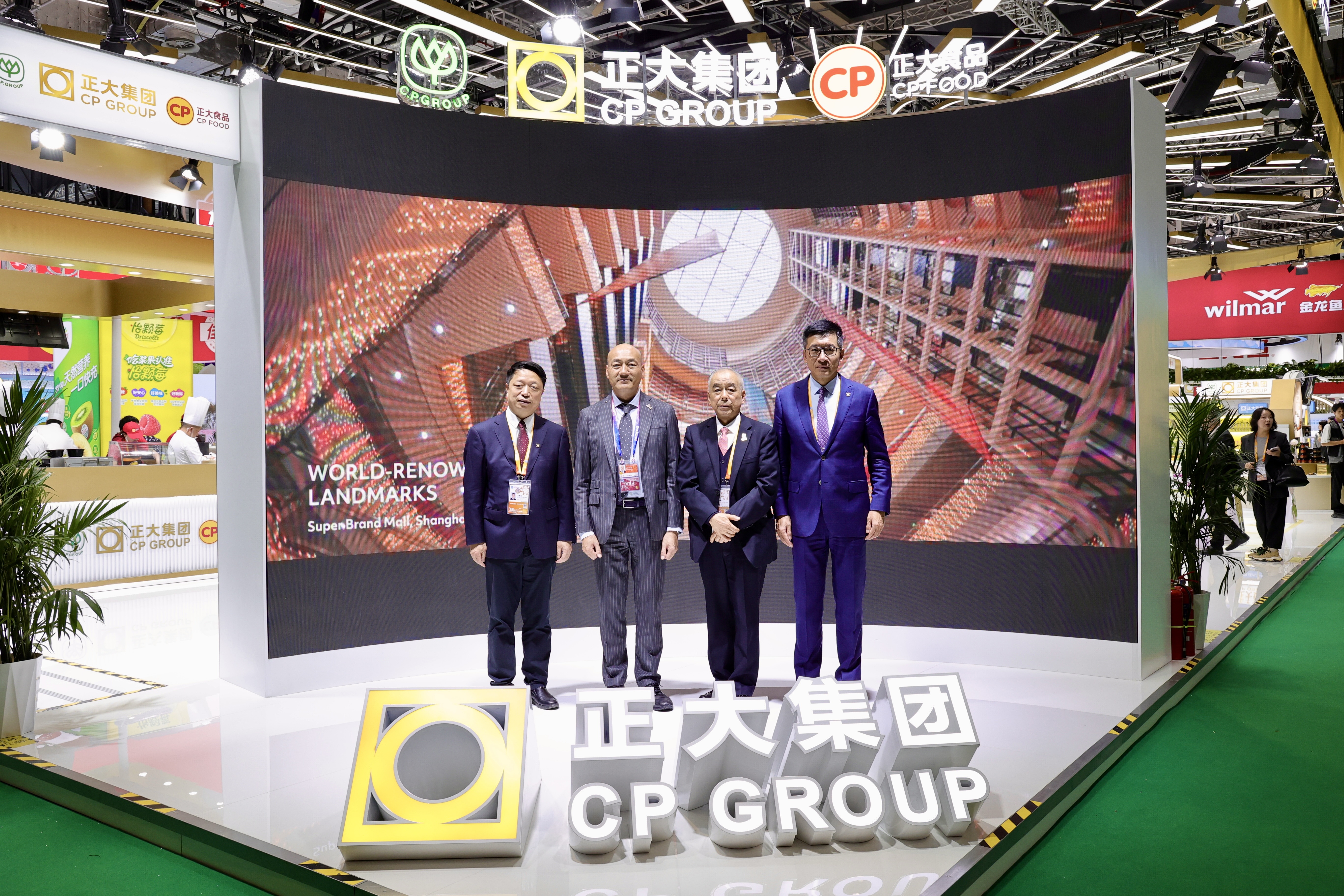 ▲11月5日,日本伊藤忠商事株式會社執行董事、東亞區總裁三村剛(左二)一行參觀正大展館,薛增一資深副董事長(右二)、王富杰資深副董事長(左一)、揚綱副董事長(右一)熱情接待來賓并合影留念。