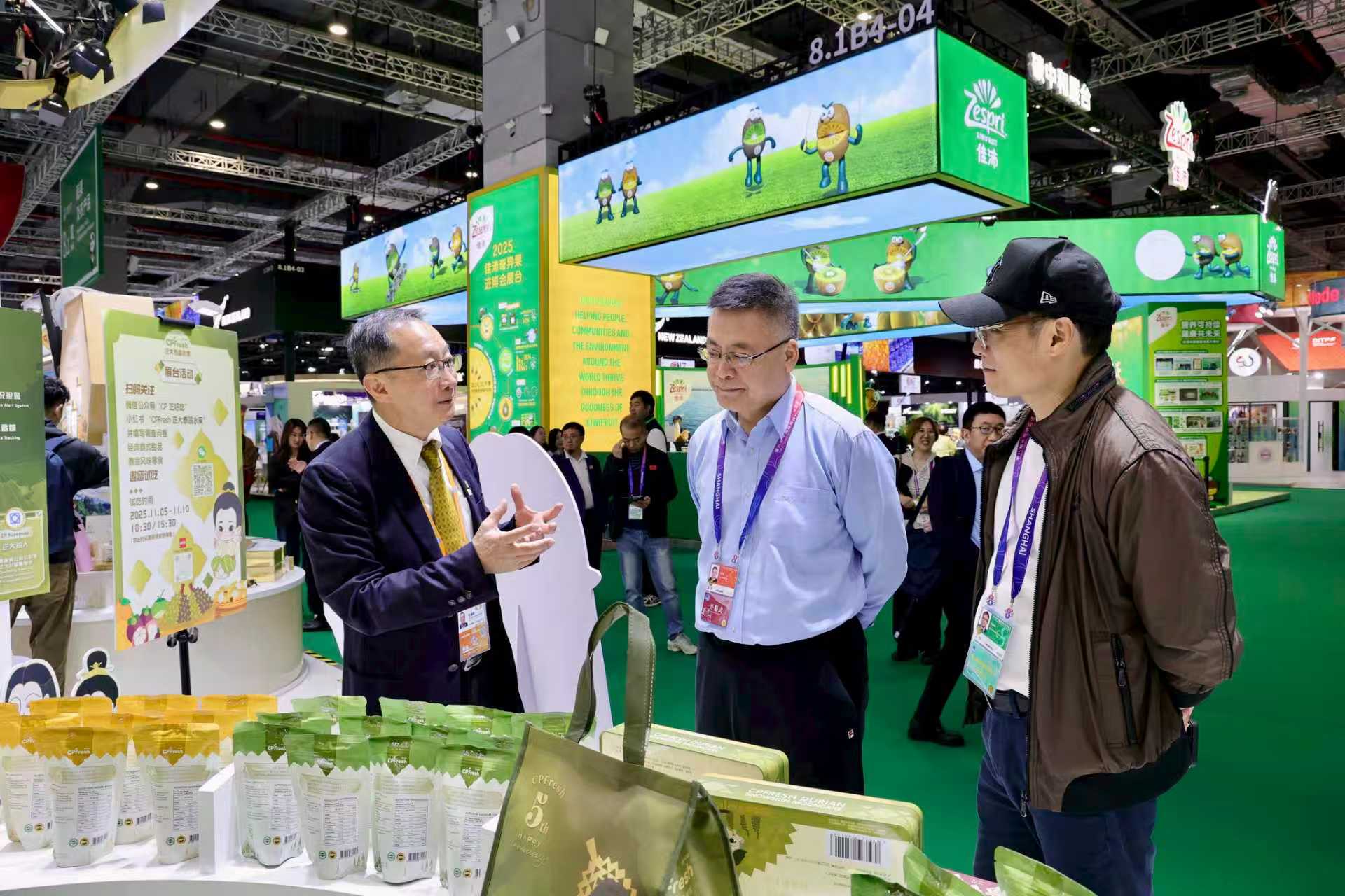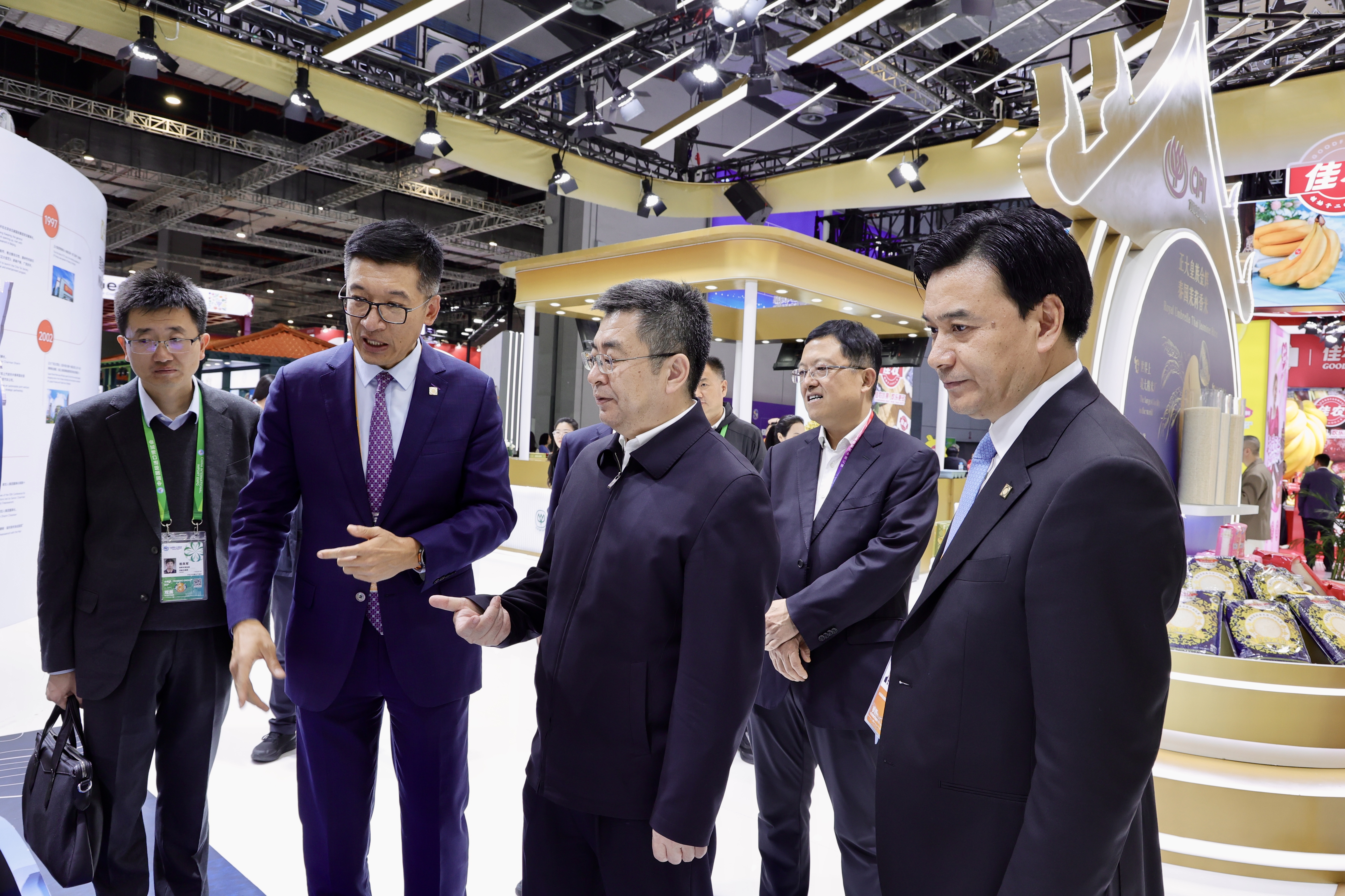 ▲11月5日,中央廣播電視總臺農業農村節目中心副主任王世林(中)一行參觀正大展館,張曙暉資深總裁(左)熱情接待來賓并介紹CP Fresh泰國水果產品。
