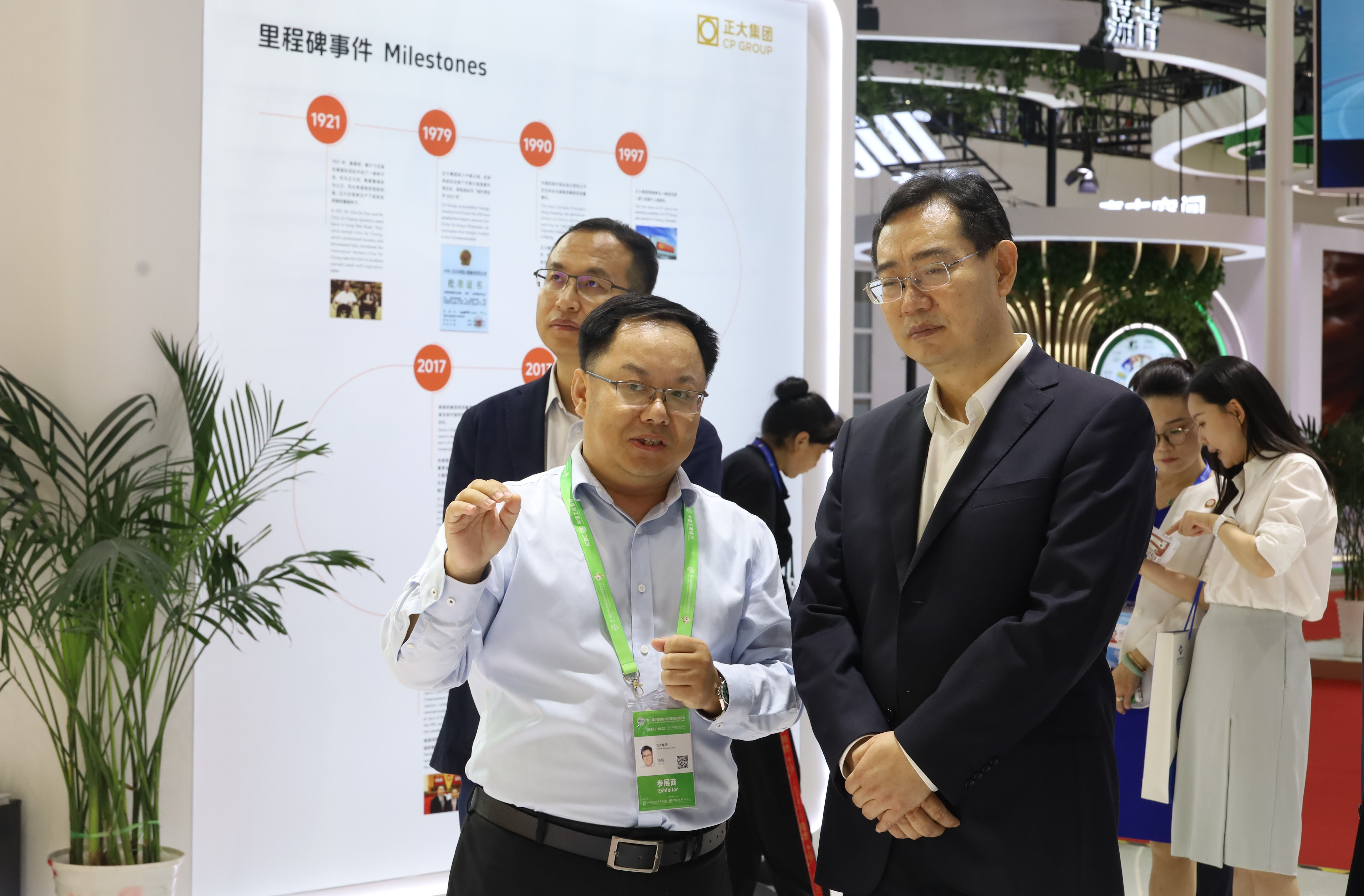 吉林省貿促會會長許濤(中)一行參觀正大展館,張曙暉資深總裁(左)熱情接待來賓并介紹全產業鏈互動展示飛屏。