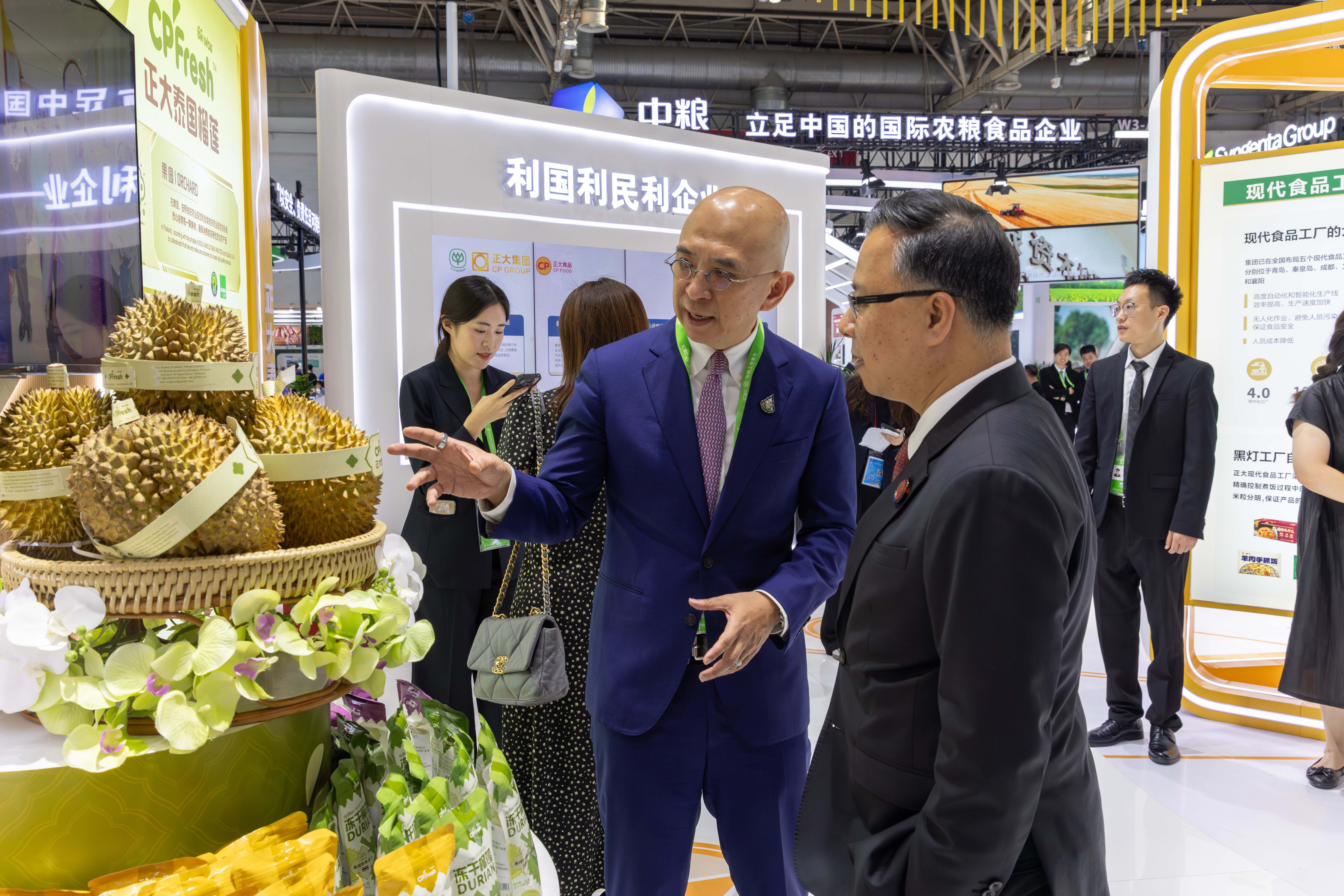 內蒙古自治區人大常委會黨組副書記、常務副主任林少春(右)一行參觀正大展館,楊森源財務長(左)熱情接待來賓并介紹正大泰國榴蓮。