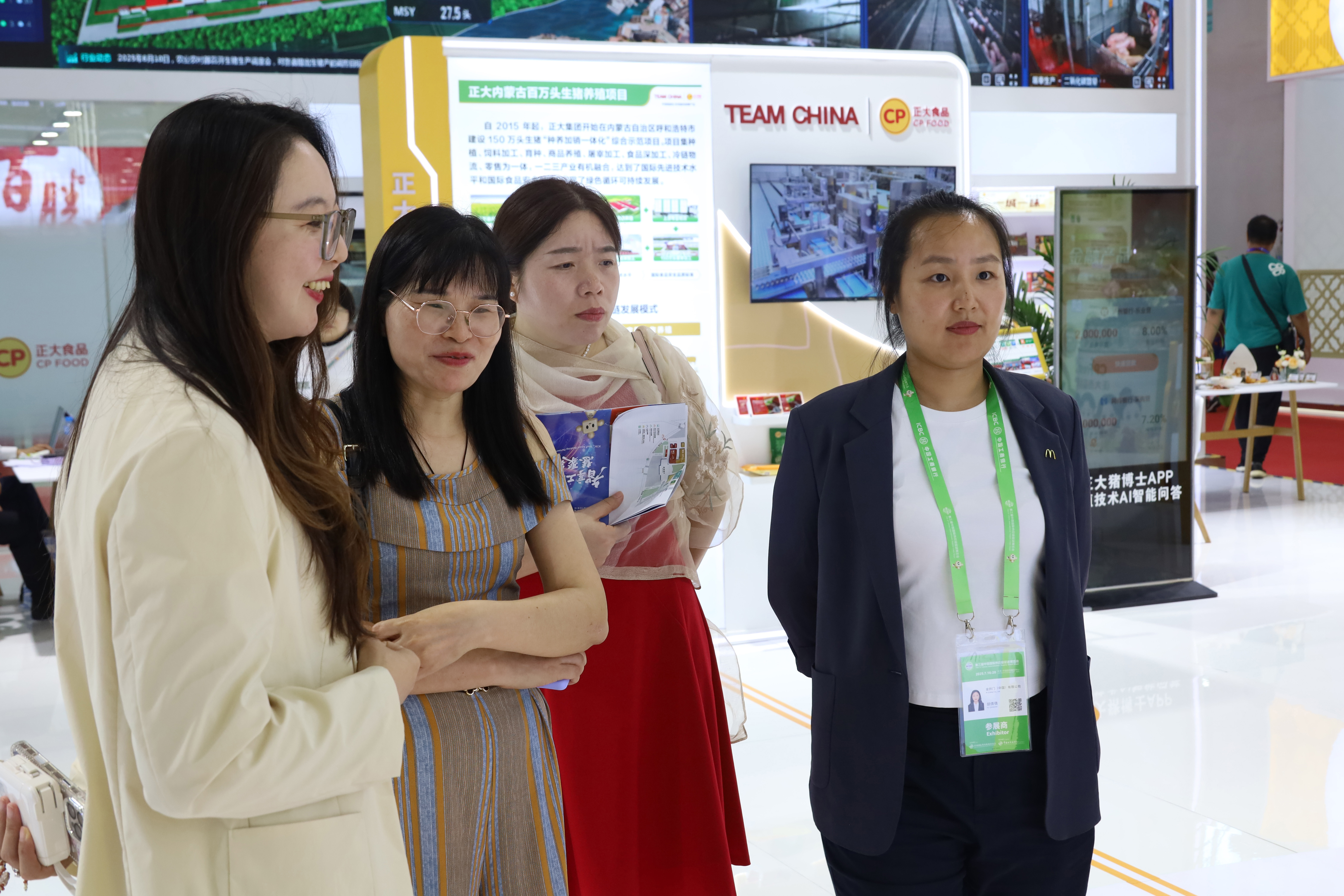 麥當勞合作伙伴展團一行參觀正大展館,正大集團農牧食品企業中國區市場中心品牌傳播經理孟徽(左一)熱情接待來賓。