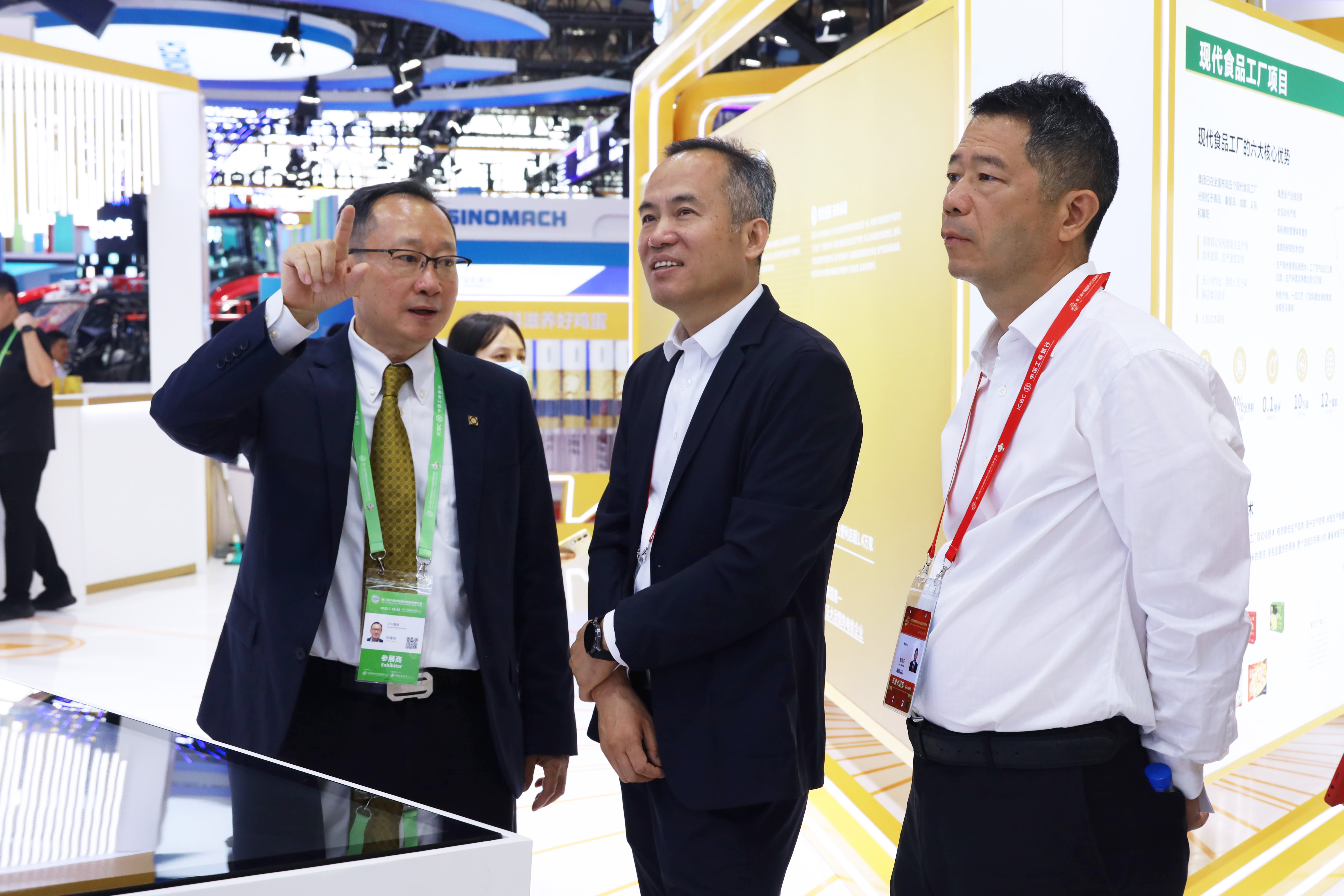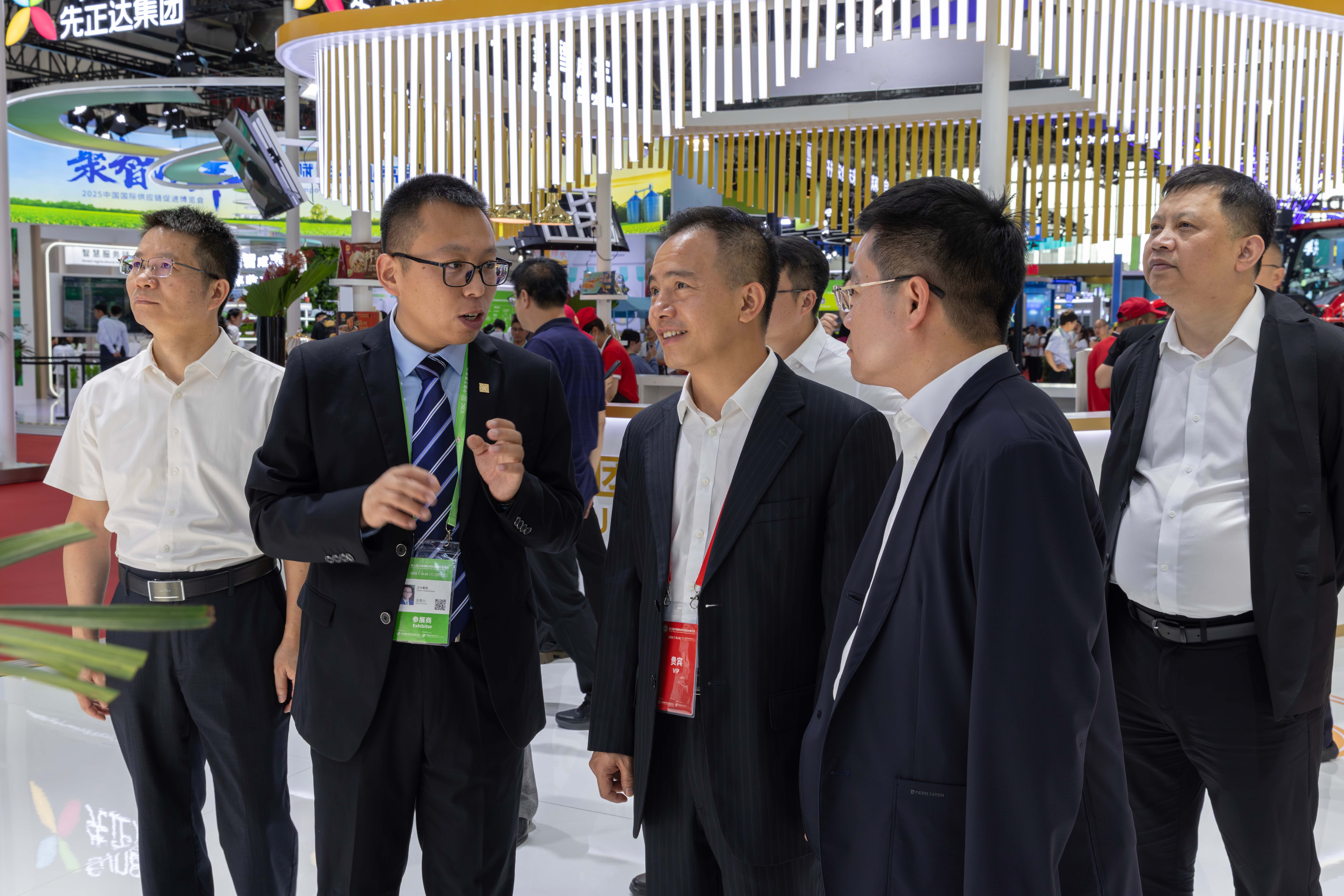 中國貿促會會長任鴻斌(中)、副會長陳建安(右一)一行參觀正大展館,正大集團農牧食品企業中國區市場中心市場活動總監楊帆(左一)熱情接待來賓。任鴻斌會長高度評價正大展館,他表示,正大集團本屆參展效果突出,生態樹設計深度契合鏈博會主題。考察正大內蒙古百萬頭生豬養殖項目展區時,他還特別稱贊:“正大全產業鏈食材品質卓越。”