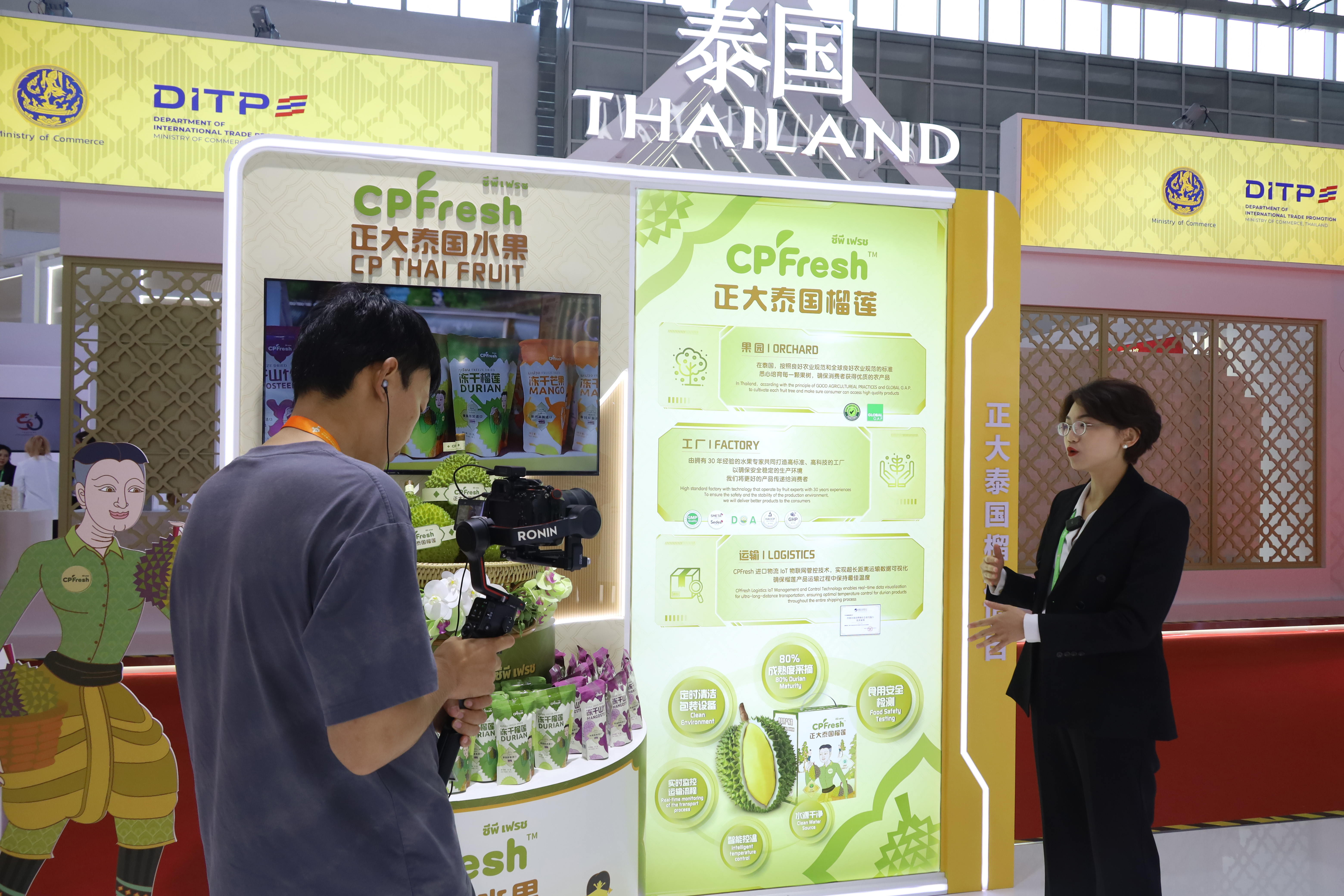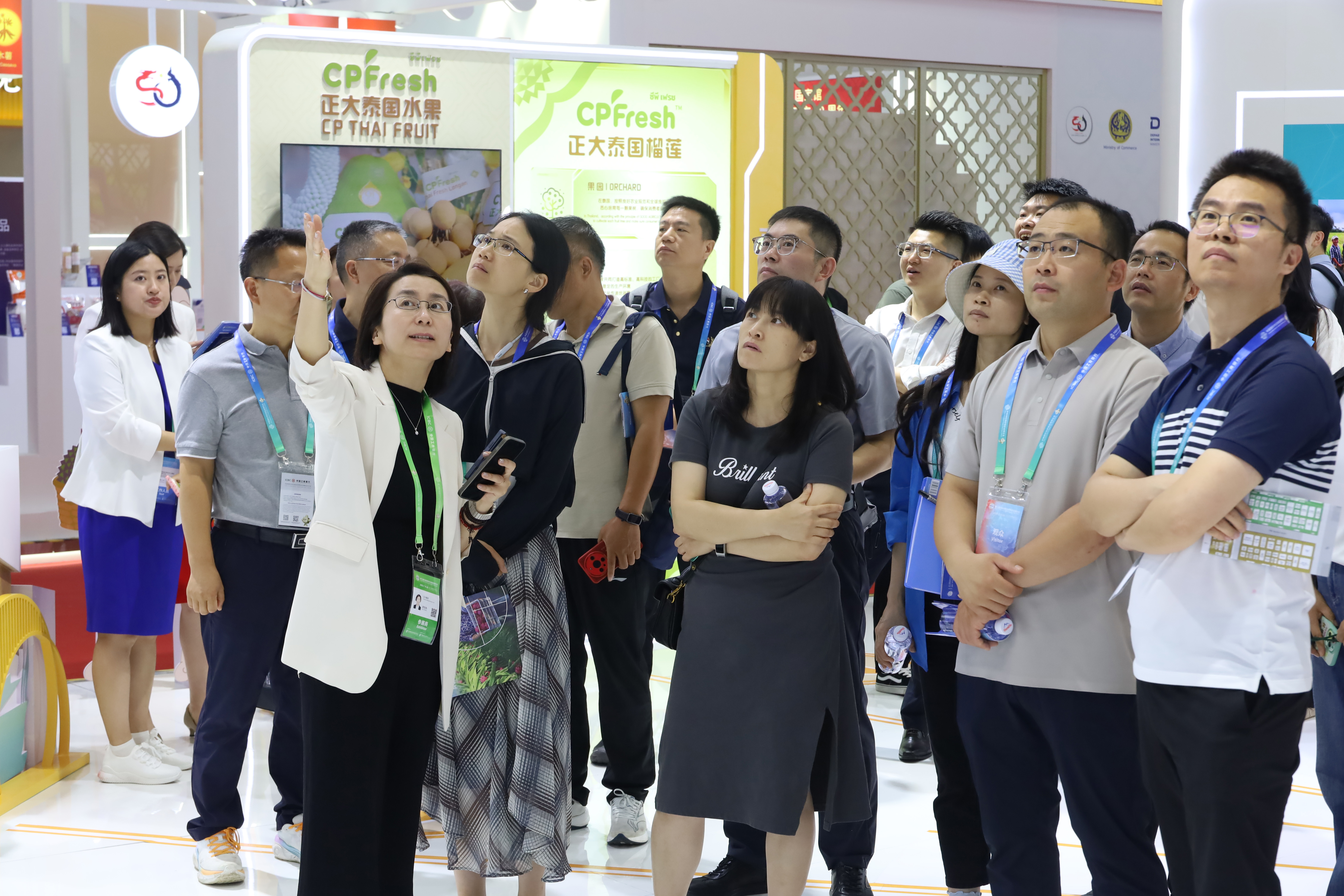 商務部歐亞司一行參觀正大展館,正大集團農牧食品企業中國區市場中心品牌傳播總監郭悅楊(右)熱情接待來賓。