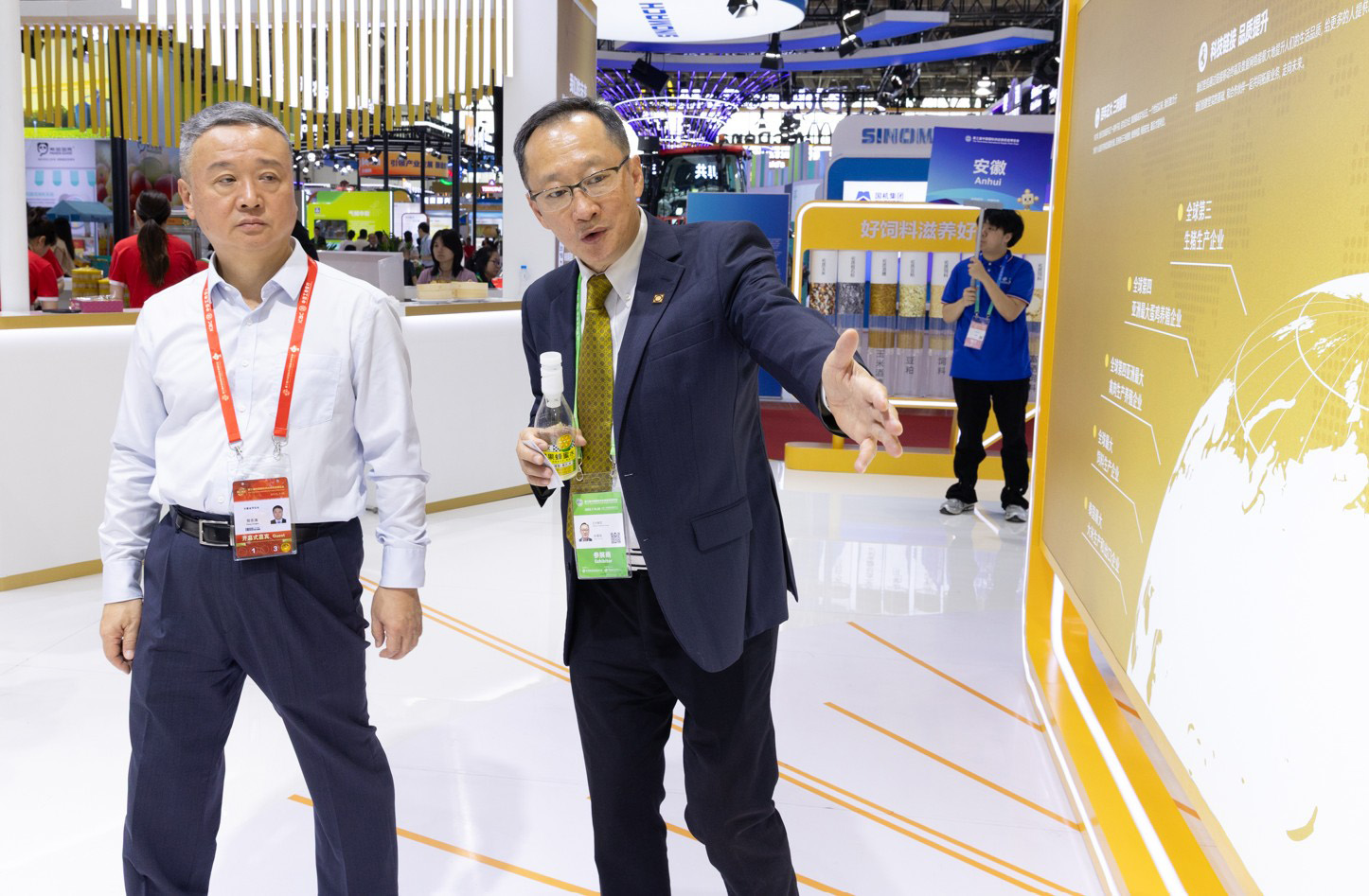 ▲正大集團資深副董事長謝明欣(右二)在正大展館考察指導,正大集團資深副總裁、中國戰略發展與合作總裁黃偉偉(右一),集團農牧食品企業中國區資深副董事長邢繼憲(左二)、資深副董事長薛增一(左一)陪同考察。
